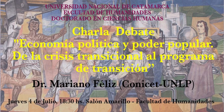 Este jueves 4 de julio, a las 18:30 horas, en el Salón Amarillo de la Universidad Nacional de Catamarca, se llevará a cabo la Charla Debate “Economía política y poder Popular. De la crisis transicional al programa de transición”.