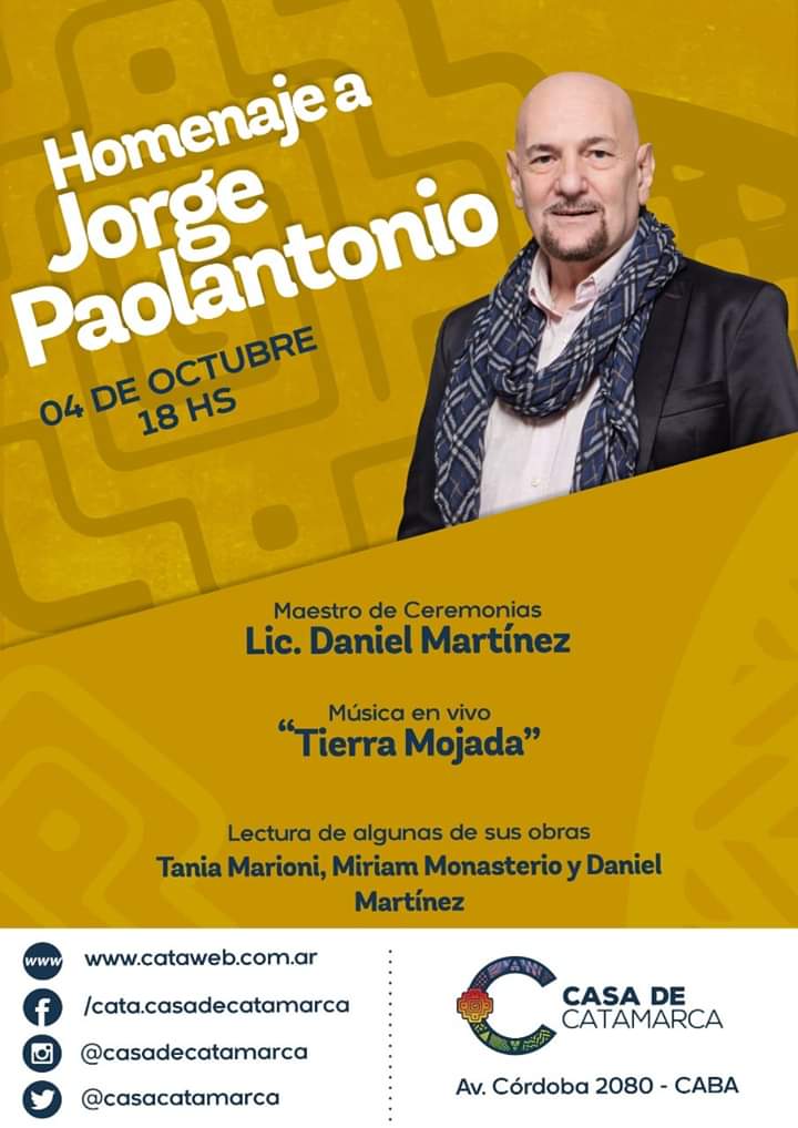 La Casa de Catamarca realizará un homenaje al escritor Jorge Paolantonio el viernes 4 de octubre a las 18 hs. en su sede de Av. Córdoba 2080 en la Ciudad Autónoma de Buenos Aires.