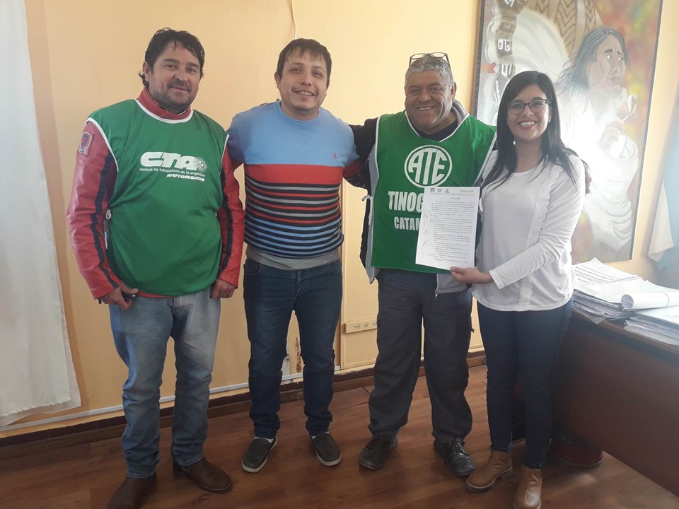 El Intendente de Tinogasta, Sebastián Noblega, y los representantes de los Gremios ATE y UPCN, acordaron el pago de un bono que habían negociado para paliar de alguna manera la situación económica que vive el País.