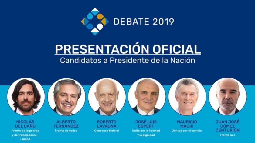El próximo 27 de octubre se llevarán a cabo las elecciones presidenciales en todo el país. Allí participarán los seis candidatos que han sorteado el umbral del 1,5% de los votos en las PASO, imprescindible para competir en la primera vuelta: Alberto Fernández, Mauricio Macri, Roberto Lavagna, Nicolás del Caño, Juan José Gómez Centurión y José Luis Espert, quienes también protagonizarán los dos debates que se desarrollarán previo a los comicios nacionales.