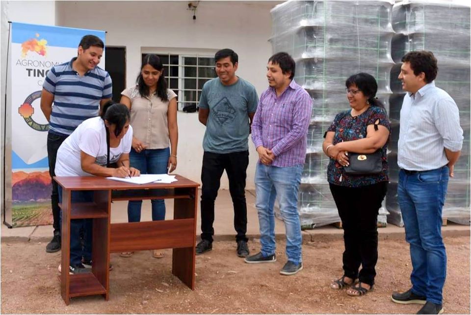 Este lunes en Agronomía de Zona del distrito de Santa Rosa, el Jefe de la repartición Técnico Dardo Morales y representantes de los pequeños productores de vinos ‘tinogasteños’, firmaron el acta de entrega de las botellas de vidrio para envasar vinos de elaboración local.