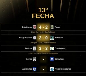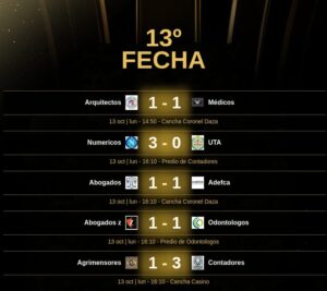 Así también en el predio de Contadores, los locales Numéricos derrotaron por 3 a 0 a los muchachos de UTA. Mientras que, en cancha de Odontólogos, el local y Abogados Z igualaron 1 a 1.
