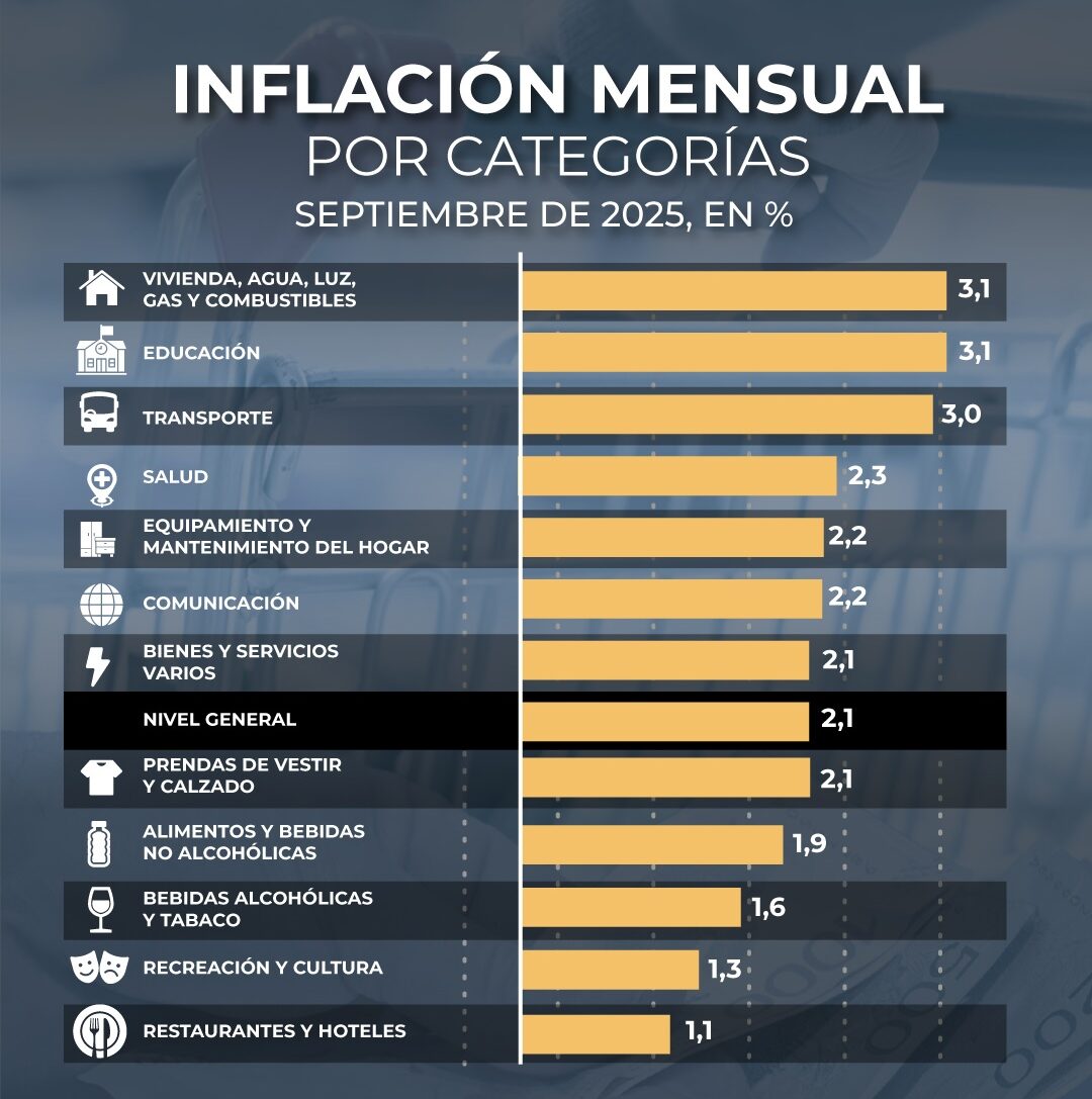 Tal como estimaban las consultoras privadas, la inflación tuvo una leve aceleración en septiembre: fue del 2,1% según el Instituto Nacional de Estadística y Censos (Indec). Con este dato, la variación para los últimos doce meses fue de 31,8% y acumuló 22% en lo que va del 2025.