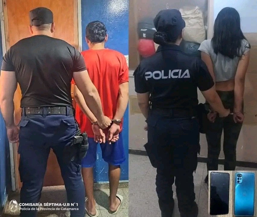 En la calle Costanera Diaguitas del barrio Eva Perón, personal de la Comisaría Séptima aprehendió a una jovencita y a un joven de apellidos Castro (18) y Varela (21) respectivamente, quienes fueron sindicados por una mujer de 56 años de edad, como los presuntos autores de haberle sustraído un teléfono celular Motorola G-22, que fue recuperado y quedó en calidad de secuestro.