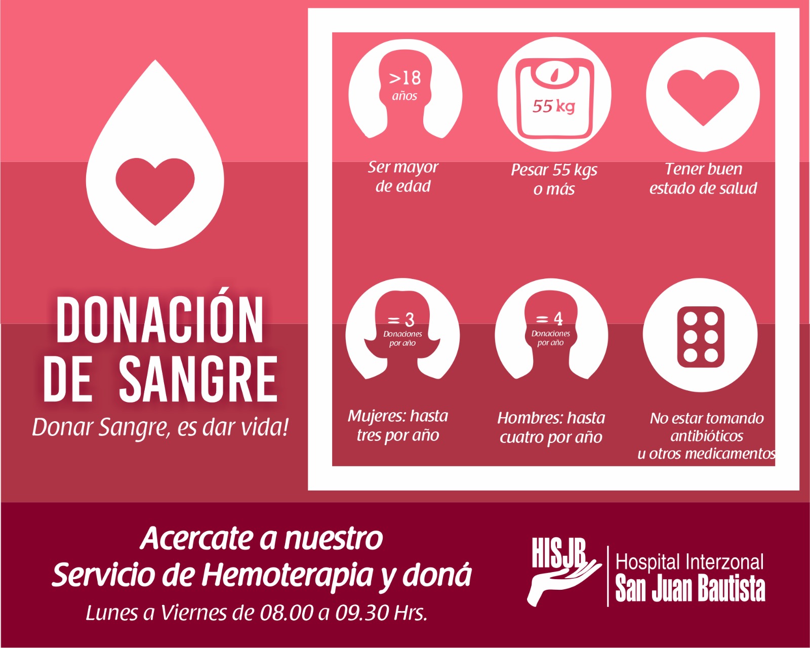 El Servicio de Hemoterapia del Hospital Interzonal San Juan Bautista realiza extracciones de lunes a viernes, de 08:00 a 09:30 horas; se debe concurrir con documento de identidad o identificación legal.