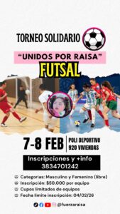 Con el objetivo de recaudar fondos para que la niña Raisa pueda llevar adelante un tratamiento médico en México, el próximo 7 y 8 de febrero se llevará a cabo un torneo de Futsal solidario.