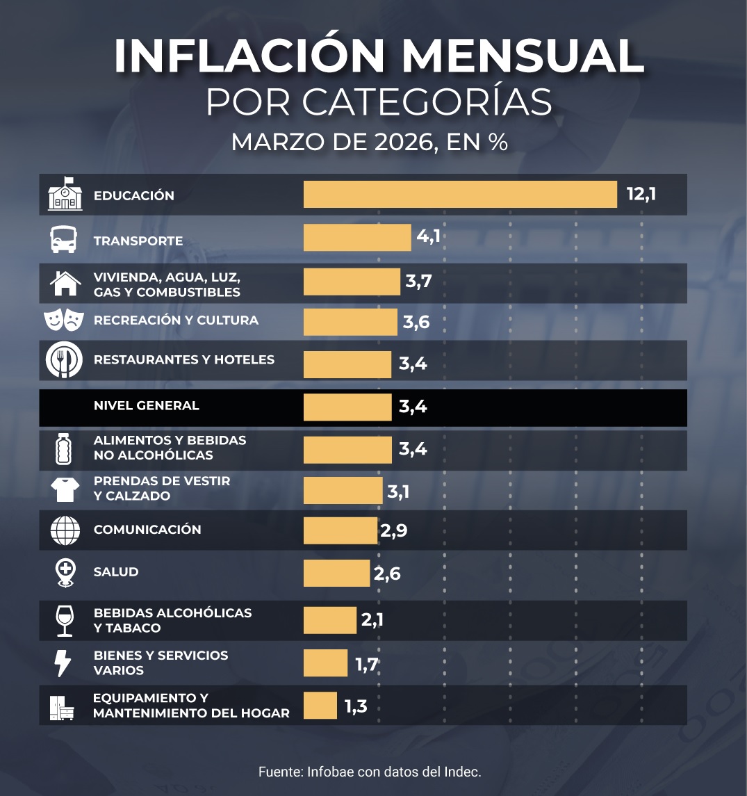 La inflación de marzo alcanzó 3,4%, según el índice publicado por el Instituto Nacional de Estadística y Censos (Indec), lo que implica un incremento de 0,5 puntos porcentuales respecto al 2,9% que había marcado en febrero. Se trata de la mayor cifra desde el mismo mes de 2025, cuando arrojó 3,7 por ciento.