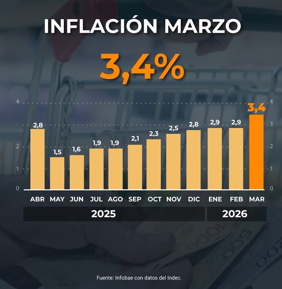 Gráfico de barras mostrando la inflación mensual de abril 2025 a marzo 2026, con el valor de marzo de 2026 en 3,4%. Fondo borroso de carro de supermercado y billetes